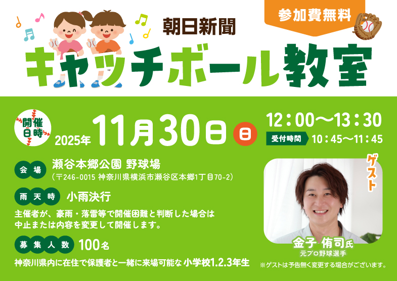 朝日新聞キャッチボール教室を、神奈川県横浜市瀬谷区で開催します。 抽選にて神奈川県内在住で保護者と一緒に来場可能な小学校1・2・3年生、100名様をご招待します。 2025年11月30日(日) ※受付時間は招待状に記載します コーチ 金子 侑司 氏 ・持ち物 ・注意事項 ・安全の注意 ・神奈川県内在住で保護者と一緒に来場可能な ・無料で参加できます 末尾の「次へ」ボタンから必要事項を入力の上、ご応募ください。 ・ご応募には朝日新聞グループの共通ID「朝日ID」の登録が必要です ・すでに朝日IDをお持ちの場合はログインをしてからご応募ください 朝日新聞スポーツスクール運営事務局 TEL:0120-003-706 朝日新聞キャッチボール教室開催!
