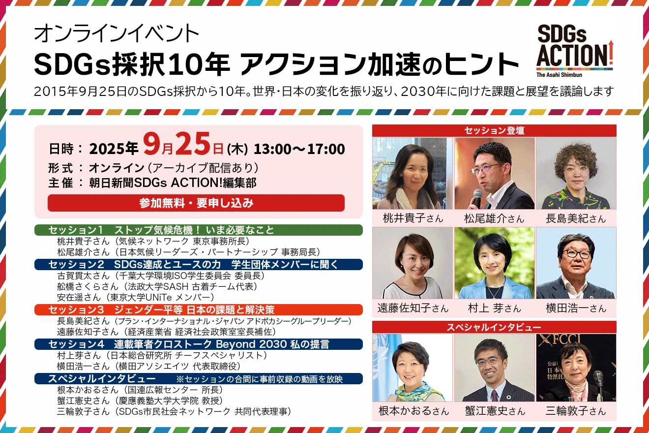 2015年9月25日のSDGs採択から10年。世界・日本の変化を振り返り、2030年に向けた課題と展望を議論します。※登壇者や内容は変更する場合があります