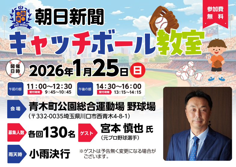 朝日新聞キャッチボール教室を、埼玉県川口市で開催します。 埼玉県内在住で保護者と一緒に来場可能な小学校1・2・3・4年生、各回130名、計260名を抽選でご招待します。 2026年01月25日(日) ゲスト ・持ち物 ・注意事項 ・安全の注意 ・埼玉県内在住で保護者と一緒に来場可能な小学校1・2・3・4年生 ・無料で参加できます 末尾の「次へ」ボタンから必要事項を入力の上、ご応募ください。 ・ご応募には朝日新聞グループの共通ID「朝日ID」の登録が必要です ・すでに朝日IDをお持ちの場合はログインをしてからご応募ください 朝日新聞スポーツスクール運営事務局 〒330-0854 TEL:0120-003-706
