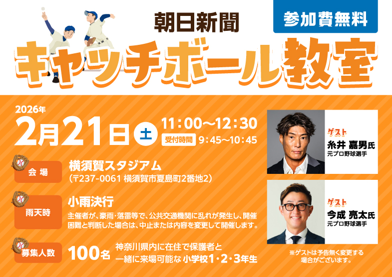 朝日新聞キャッチボール教室を、神奈川県横須賀市で開催します。 抽選にて神奈川県内在住で保護者と一緒に来場可能な小学校1・2・3年生、100名様をご招待します。 2026年2月21日(土) ※受付時間は招待状に記載します ゲスト 糸井 義男 氏 今成 亮太 氏 ・持ち物 ・注意事項 ・安全の注意 ・神奈川県内在住で保護者と一緒に来場可能な ・無料で参加できます 末尾の「次へ」ボタンから必要事項を入力の上、ご応募ください。 ・ご応募には朝日新聞グループの共通ID「朝日ID」の登録が必要です ・すでに朝日IDをお持ちの場合はログインをしてからご応募ください 朝日新聞スポーツスクール運営事務局 TEL:0120-003-706