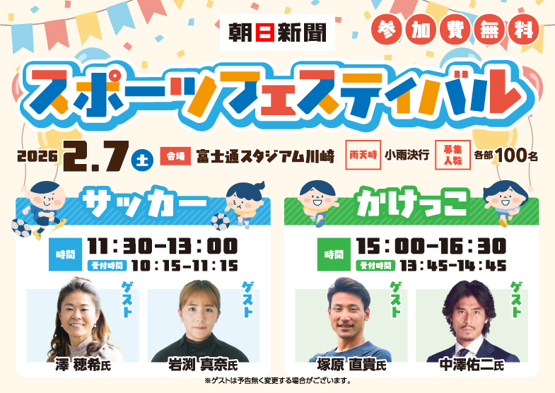 朝日新聞「スポーツフェスティバル【サッカー】【かけっこ】」を神奈川県川崎市「富士通川崎スタジアム」で開催致します。 東京都・神奈川県内在住で保護者と一緒に来場可能な小学校1・2・3年生、各回100名、計200名を抽選で無料でご招待致します。 サッカー経験、性別は問いません。 2026年2月7日(土) ゲスト【サッカー】 岩渕 真奈氏(元なでしこジャパン) ゲスト【かけっこ】 塚原 直貴氏(陸上元日本代表:2008北京五輪4×100mリレー銀メダリスト) 中澤 佑二氏(サッカー元日本代表) コーチ【かけっこ】 城西大学 陸上競技部 ・持ち物 ・注意事項 ・安全の注意 ・東京都・神奈川県内在住で保護者と一緒に来場可能な小学校1・2・3年生 ・無料で参加できます。サッカー経験、性別は問いません。 末尾の「次へ」ボタンから必要事項を入力の上、ご応募ください。 ・ご応募には朝日新聞グループの共通ID「朝日ID」の登録が必要です ・すでに朝日IDをお持ちの場合はログインをしてからご応募ください。 ・お子様お一人につき、1件のみのお申し込みでお願い致します。 ・別アドレス等で、複数お申し込みはお控えください。 ・ご兄弟姉妹等でお申し込みの場合は、お子様一人ずつお申込みください。 朝日新聞スポーツフェスティバル運営事務局 〒107-0062 TEL:0120-003-706