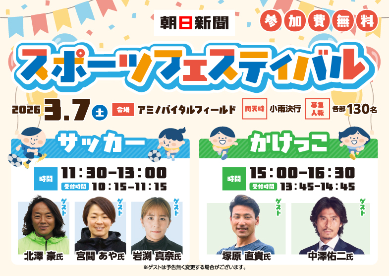 朝日新聞「スポーツフェスティバル【サッカー】【かけっこ】」を東京都調布市「アミノバイタルフィールド」で開催致します。 東京都内在住で保護者と一緒に来場可能な小学校1・2・3年生、各回130名、計260名を抽選で無料でご招待致します。 サッカー経験、性別は問いません。 2026年3月7日(土) ゲスト【サッカー】 宮間 あや氏(元なでしこジャパン) 岩渕 真奈氏(元なでしこジャパン) ゲスト【かけっこ】 塚原 直貴氏(陸上元日本代表:2008北京五輪4×100mリレー銀メダリスト) 中澤 佑二氏(サッカー元日本代表) コーチ【かけっこ】 城西大学 陸上競技部 ・持ち物 ・注意事項 ・安全の注意 ・東京都内在住で保護者と一緒に来場可能な小学校1・2・3年生 ・無料で参加できます。サッカー経験、性別は問いません。 末尾の「次へ」ボタンから必要事項を入力の上、ご応募ください。 ・ご応募には朝日新聞グループの共通ID「朝日ID」の登録が必要です ・すでに朝日IDをお持ちの場合はログインをしてからご応募ください。 ・お子様お一人につき、1件のみのお申し込みでお願い致します。 ・別アドレス等で、複数お申し込みはお控えください。 ・ご兄弟姉妹等でお申し込みの場合は、お子様一人ずつお申込みください。 朝日新聞スポーツフェスティバル運営事務局 〒107-0062 TEL:0120-003-706