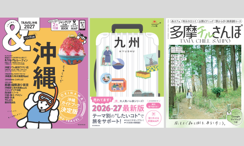 アンケートにお答えいただいた方から抽選で、「&TRAVEL沖縄」「ハレ旅九州」「多摩チルさんぽ」(朝日新聞出版)の中から1冊を15名様にプレゼントします。 応募締切 2026年5月8日(金)23:59 プレゼント アンケートにご回答いただいた中から抽選で15名様に、「&TRAVEL沖縄」「ハレ旅九州」「多摩チルさんぽ」の中から1冊をプレゼントします。