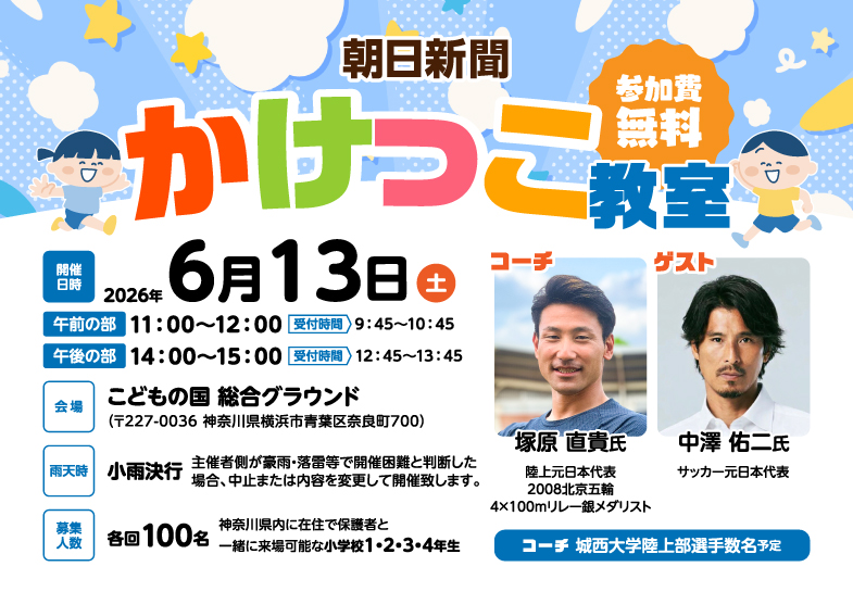 朝日新聞かけっこ教室を、神奈川県横浜市で開催します。 抽選にて神奈川県在住で保護者と一緒に来場可能な小学校1・2・3・4年生、各回100名様をご招待します。 2026年6月13日(土) ※受付時間は招待状に記載します コーチ 塚原 直貴 氏 ゲスト 中澤 佑二 氏 ・持ち物 ・注意事項 ・安全の注意 ・東京都内在住で保護者と一緒に来場可能な ・無料で参加できます 末尾の「次へ」ボタンから必要事項を入力の上、ご応募ください。 ・ご応募には朝日新聞グループの共通ID「朝日ID」の登録が必要です ・すでに朝日IDをお持ちの場合はログインをしてからご応募ください 朝日新聞スポーツスクール運営事務局 TEL:0120-003-706
