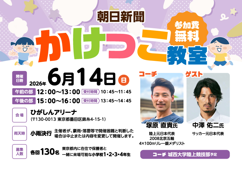 朝日新聞かけっこ教室を、東京都墨田区で開催します。 抽選にて東京都内在住で保護者と一緒に来場可能な小学校1・2・3・4年生、各回130名様をご招待します。 2026年6月14日(日) ※受付時間は招待状に記載します コーチ 塚原 直貴 氏 ゲスト 中澤 佑二 氏 ・持ち物 ・注意事項 ・安全の注意 ・東京都内在住で保護者と一緒に来場可能な ・無料で参加できます 末尾の「次へ」ボタンから必要事項を入力の上、ご応募ください。 ・ご応募には朝日新聞グループの共通ID「朝日ID」の登録が必要です ・すでに朝日IDをお持ちの場合はログインをしてからご応募ください 朝日新聞スポーツスクール運営事務局 TEL:0120-003-706